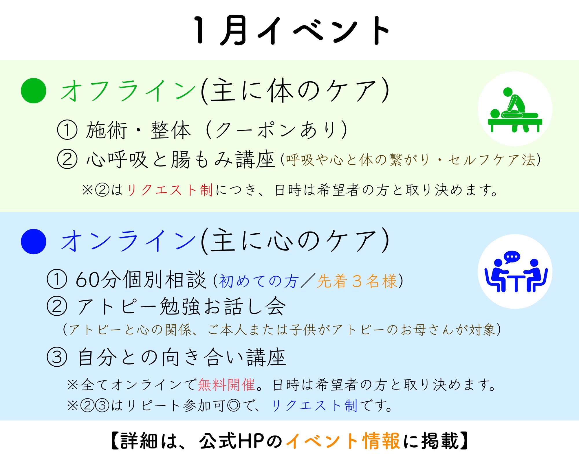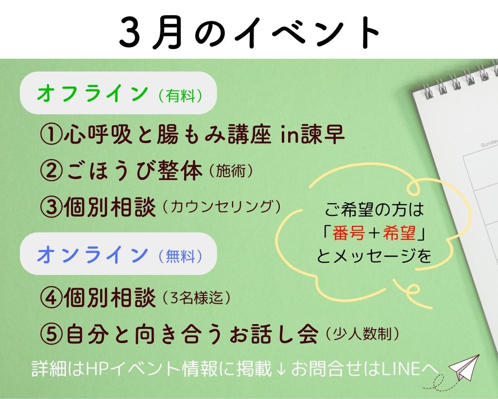 ①心呼吸と腸もみ講座(オフライン) 〈こんなお悩みの方におすすめ〉 ・呼吸(息)がしづらい ・腸活に興味がある ・病気症状の悩み ・病院や薬に頼りたくない ・子供、家族が当事者 ・生活習慣を見直したい ・セルフケアを身につけたい ・心と体について知りたい ・自分を知りたい(向き合いたい)等… 当講座では、自分が本来持つ免疫[...] 詳細はこちら