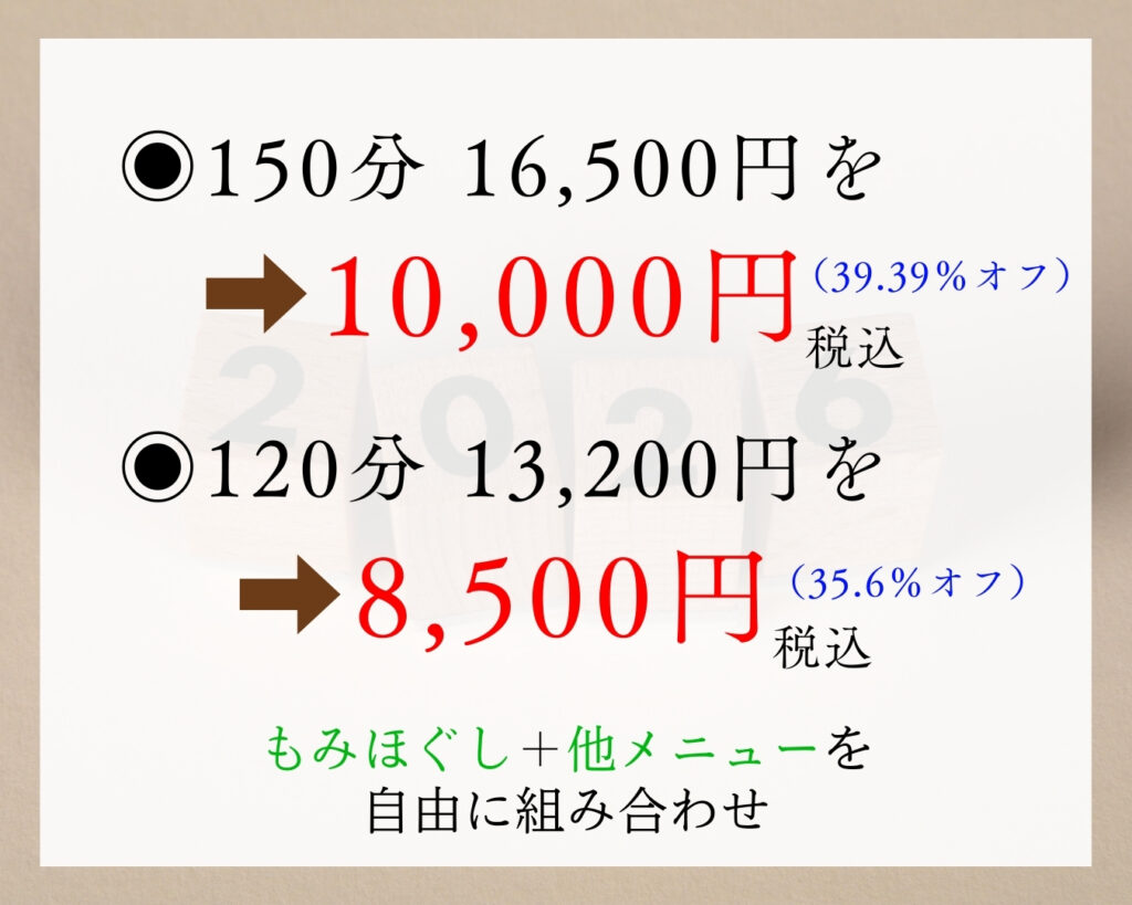 | 時間 | 150分/120分(もみほぐし整体+他3種類組み合わせ) |
