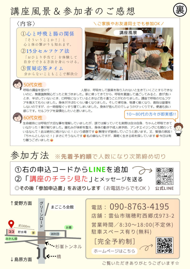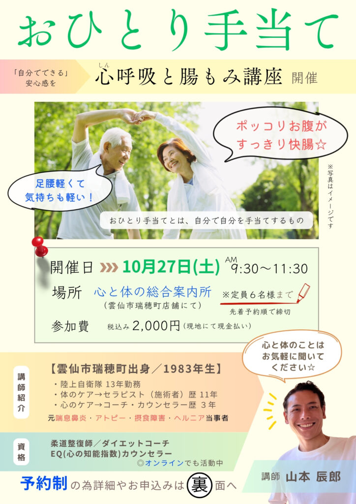 内容 ①心と呼吸と腸の関係~②15分セルフケア法~③質疑応答